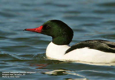 Common Merganser (Mergus merganser)*: commonly seen in wooded lakes and rivers in North America; overwinters across USA until early spring when they migrate to breeding grounds in inland Canada and Alaska; forages by diving and swimming under water to find fish, its principle diet; mom is often seen carrying her young on her back as she swims along!